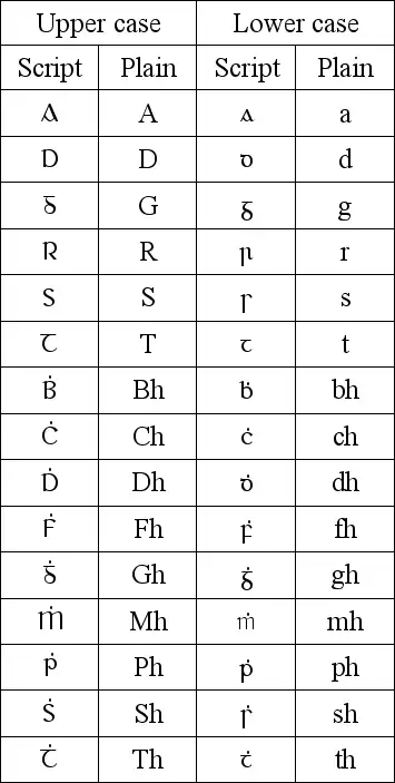Modern Irish street signs use a standard Latin font with an alphabet which includes the letters A to Z plus vowels with síntí fada Á É Í Ó Ú (in Irish this is shown with an acute accent, unlike Scots Gaelic, which uses a grave accent to denote a similar thing). Older street signs can use an Irish script font which includes alternative forms for some of the letters, along with letters with a dot above them, which is transliterated into Roman script as an 'h' following the dotted letter. The following table gives an example of the mapping: