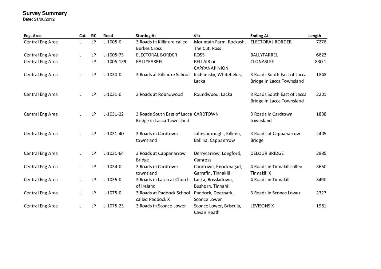| Western | L-1050-20 | 4 Roads at Clonoghil Called Clonoghil X | Marymount, Clonoshill, Cloncully, Rossnorragh, Clonnonagh, Lackey | 3 Roads at Lackey/Clonoonagh Boundary | 3817 | 100% | AndrewMcCarthy 23:04, 1 October 2012 (BST) | |