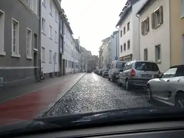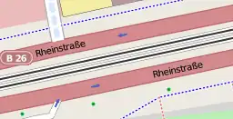 Secondary street with embedded tramrails. The tram lines are tagged separately left and right of the highway (see Trams). |