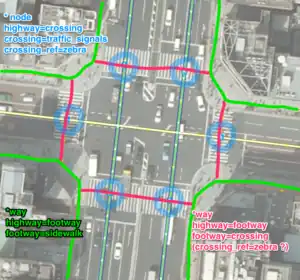 | 属性としてのタグ付けと別個のウェイを組み合わせた例 - 交差点 & 縁石の完全マッピング | |