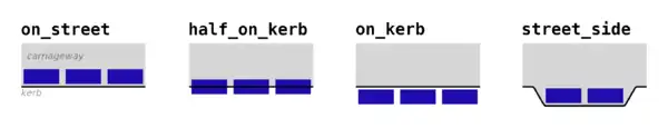 on_streethalf_on_kerb(側道に一部乗り上げる)on_kerb(側道上)street_side(車道に直接隣接する駐車ベイ)- 過去には路傍の駐車スペースによく使用されていましたが、本来レイバイ(休憩所)(Wikipedia)を意図していました。lay_byamenity=parking+parking=laybyでタグ付けされるものとの区別は明確ではありません。代わりにstreet_sideを用いるべきです。もし本当にレイバイをマッピングしたい場合は、下線のないlaybyを検討してください。painted_area_onlyshoulder— 路肩(Wikipedia)は道路の区域のうち通常通行することを想定されていない堅い部分で、車道と同じかやや劣った表面になっています。shoulder=yes|left|right|bothが必要です。