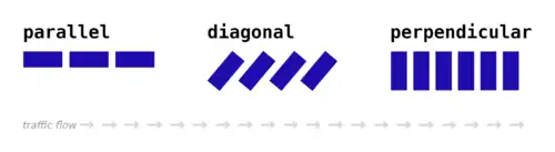 直角に駐車する必要がある。つまり、車両の前または後を道路のセンターラインに向けて駐車する。 | |
