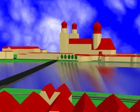 Writes an OpenGL rendering of the 3D model generated from example.osm to image.png. The rendering uses a perspective projection, with the defined coordinates for camera position and look at.