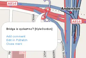 OpenStreetBugsは 地図にエラーの詳細を書き残すことができるとっても簡単なツールです。この機能は、OpenStreetMap.orgのコア機能であるNotesに置き換えられたため、非推奨となっています。OpenStreetBugsのユーザーは、何かが欠けていたり、明らかに間違っていたりした場合、地図上に短いメッセージを残すことができます。たとえば、"一方通行の向きが逆" とか、 "橋梁なのか交差点か?"など。詳細は、このページの改訂 履歴 を確認してください。