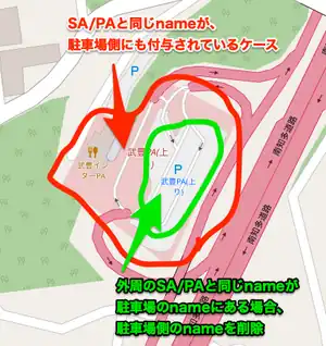 既存の amenity=parking ポリゴンに対して、SA/PAと同じ名前が入っていることがあります。