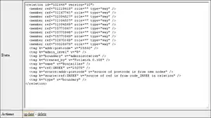 - エレメントの種別と識別子 ; OpenStreetMap.orgの専用のページにリンクしており、このエレメントを中心とした標準マップを表示します。さらにエレメント閲覧パネル(実際のタグ、版数、履歴表示リンク、デフォルトのエディタ、その他で編集するオプションといったあらゆる詳細)を開き、マップ上の幾何形状をマークします。