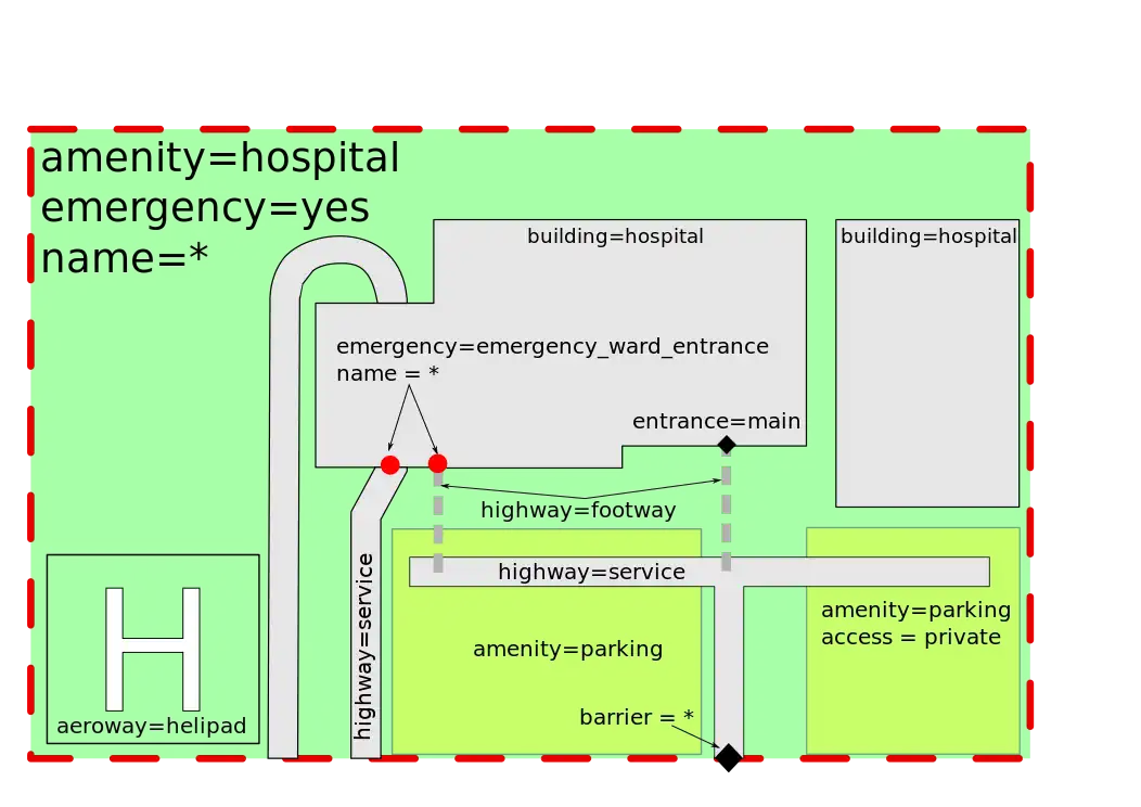 病院に救急患者を受け入れる設備(イギリスでは A&E (accidents and emergencies)、アメリカでは ER (emergency room) と呼ばれているもの)がある場合は、 emergency=* を追加して "yes" または "no" の値を設定し、救急用入口があればemergency=emergency_ward_entranceを付けたノードを追加してください。