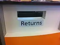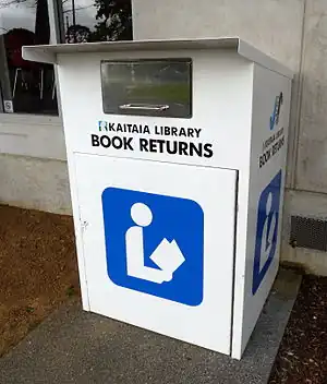 図書館から離れた返却場所(ドロップオフ)。便宜上の問題として、図書館利用者が図書館自体以外で本を返却またはドロップオフできる場所。これは多くの場合、所蔵館または置き場への配送だけができる開口部のある置き場のように見えます。