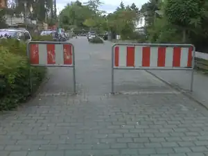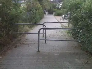 自転車の速度を落としたり、通行を完全に妨げたりするように、小道、歩道、自転車道、農道や林道に配置された車止めです。ふつう金属で作られており、 staggered chicane の形に配置されています。