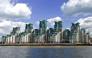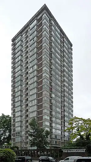集合住宅(アパートやマンション)。個人の住宅が並べられた建物で、ふつうは複数階から成ります。タグは部屋が賃貸の場合も分譲される場合にも使うことができます(日本では「マンション」と呼ばれます)。