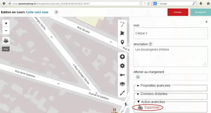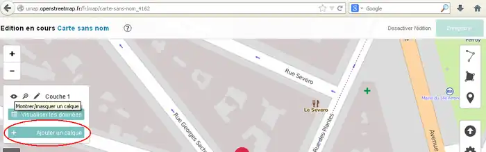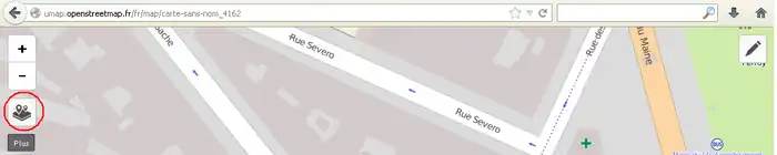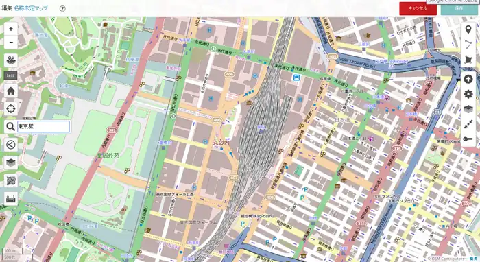 2) 左サイド7番目のボタンをクリックしてその右に開いた窓で「東京駅」などのように移動先を指定してエンターキーを押します。(2014/11/30現在、この機能はフランスの製品版インスタンスでは無効です。他(例えば http://umap.fluv.io )では有効です。)