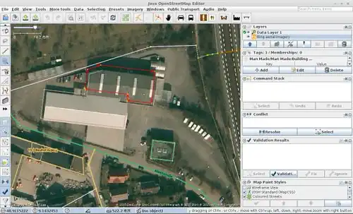 building=yestagging to whatever set of tags you desire. It doesn't even need to be buildings, you might find it useful for mapping other commonly rectangular features such asleisure=pitchandamenity=parking. The default tagging can be adjusted in the "Advanced Preferences": opening the menuJOSM -> Settings -> Advanced Preferencesand then open the entry with key "buildings_tools.tags". - Big buildings mode: When mapping in two-clicks mode, you usually click the first corner of the building and move your mouse to another. If you see that the walls don't fit to what you see on WMS image, you are supposed to press ⇧ Shift and draw one wall, clicking on the third corner afterwards. In big buildings mode, you just click on first corner, press ⇧ Shift and click on the opposite corner, rotating the building outline afterwards. (This can be activated in the "Advanced" dialog.)