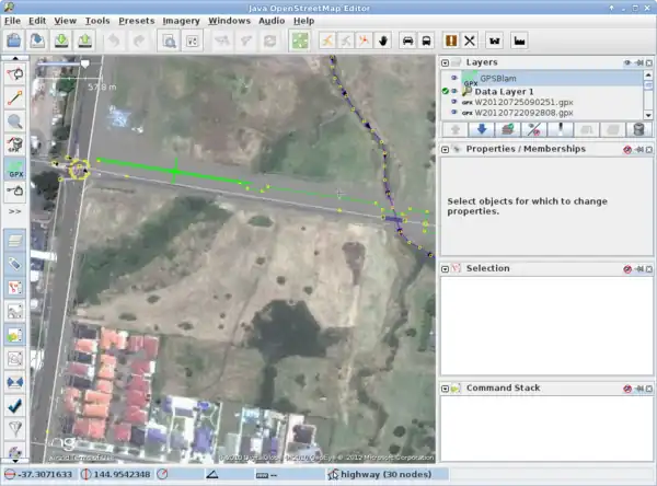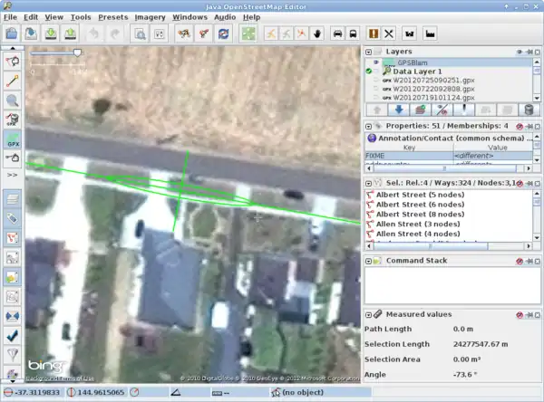 GPSBlam is a JOSM plugin designed to exploit the availability of multiple GPS tracks over the same straight-line path, to obtain a handle on the location and direction of the path with optimal accuracy. This can be useful to nail down any offsets in existing content or imagery.