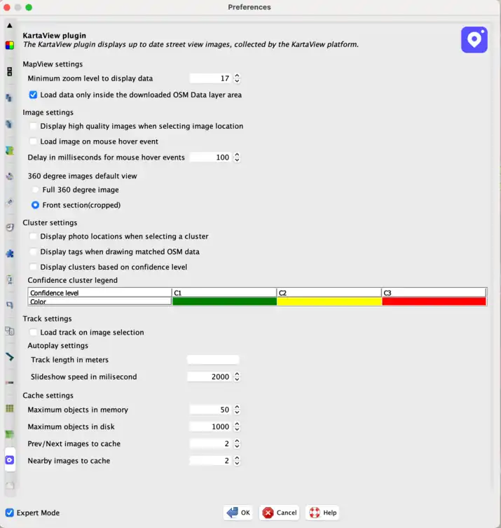The KartaView plugin can be customized from the plugin's preference settings. The preference settings can be accessed from JOSM->Preferences->KartaView plugin or from the KartaView/Edge data panel by clicking on the preference icon.