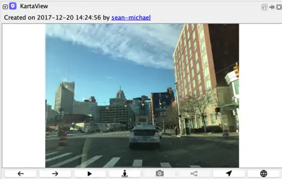 The panel also has a number of action buttons on the bottom. These are for previous image/next image/play track/nearby photo loading, switch image format to 360 degrees, download matched OSM way, centering the map to the selected image location and opening the image web page. These features are described in the next sections.