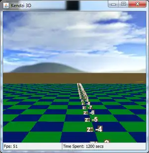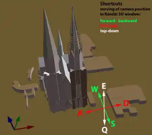 With some keys from the keyboard or moving the mouse with a pressed button in the Kendzi 3D window, you can do the following movements of the camera. Holding a directional key for a duration of time increases the speed.