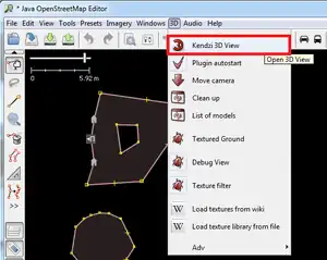 - After restart new position "3D" should appear in main JOSM menu. Select (Menu > 3D > Kendzi 3D View).