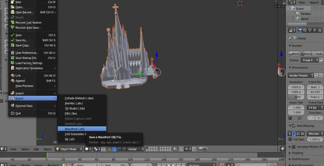 2-Once the node is inside the area, we open the model by importing it -with Blender or similar (I use Bforartists) - and export it again in obj format.