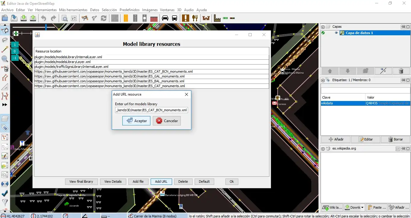 4-Returning to JOSM, in the menu 3d (plugin Kendzi3D menu) go to Models Library and click on add URL, adding the URL of the file that indicates, for example the configuration of the models of the city of Barcelona https://raw.githubusercontent.com/yopaseopor/monuments_kendzi3D/master/ES_CAT_BCN_monuments.xml