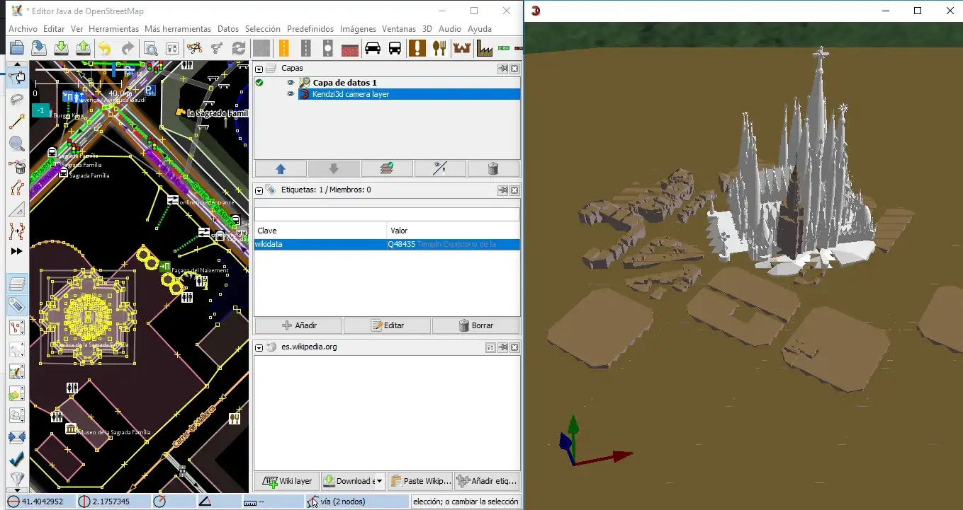 5-Now we can navigate with the Kendzi3D View for the area that we have downloaded with JOSM, if we want to see further we just move a little more and thanks to continuousDownload plug-in the data will go down as you move.