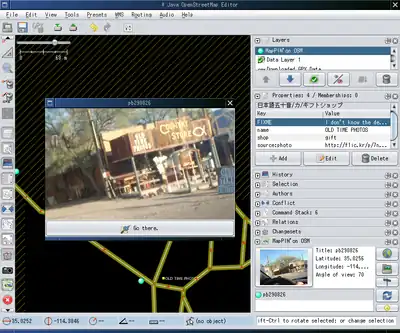 This plugin integrates MapPIN'on OSM into JOSM. You can view photo markers. If the original photo is allowed to be download directory, you can download it and view in JOSM.