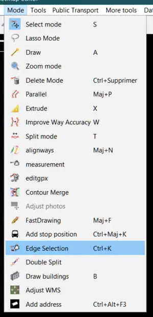 - Edge selection: Select several connected ways that are suitable for the mode of transport, for which the relation editor window has focus. An edge is a continuous set of ways between 'forks' or between a fork and where a stop_position is the end node of a way.