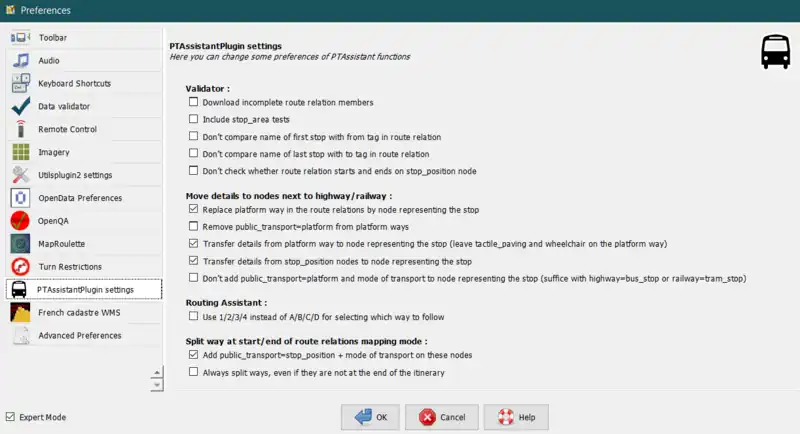 - If you activate the "Download incomplete route relation members" option in the Preferences => PTAssistantPlugin settings while working on a large dataset, select the desired route relations before validating, otherwise the download of incomplete members may take too long.