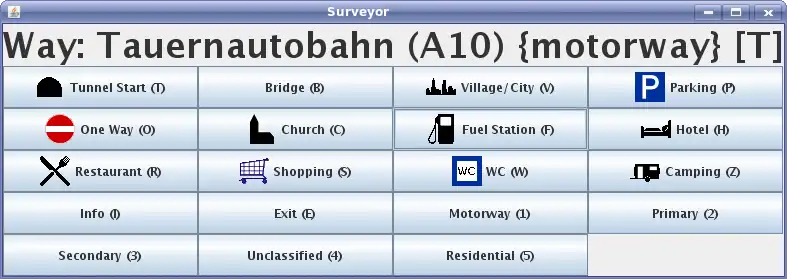 The image above shows the surveyor frame (including the current way from the loaded OSM data (showing name (ref) {highway-type} and [tunnel/bridge]). A single button press executes an action. There are also toggle buttons that may indicate an on/off state (like start/end of bridge). In this case, the text of the new marker is automatically extended with a "start" or "end".