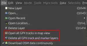 As the plugin may open a number of GPX track layers and GPX marker layers at a time, it also provides a menu option for deleting all GPX layers at a time.