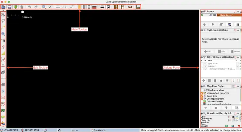 The main toolbar sits horizontally at the top of the JOSM window. It can be customized and generally contains the save, upload, download and undo/redo buttons along with shortcuts to common tools, imageries, or other presets.