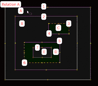 In this example, Relation E has two additional outer rings, E2 and E3, that are separate from the main polygon but are still part of the multipolygon.