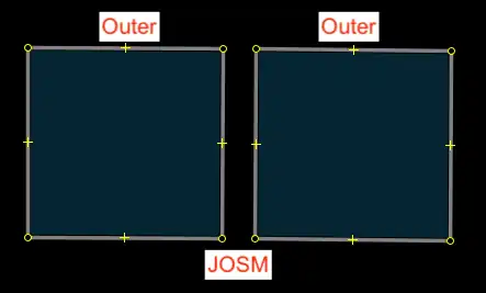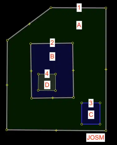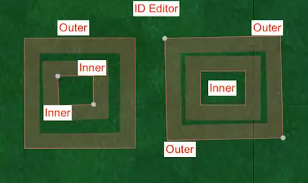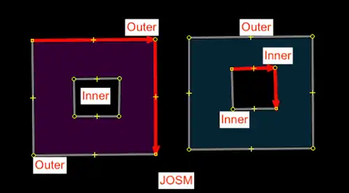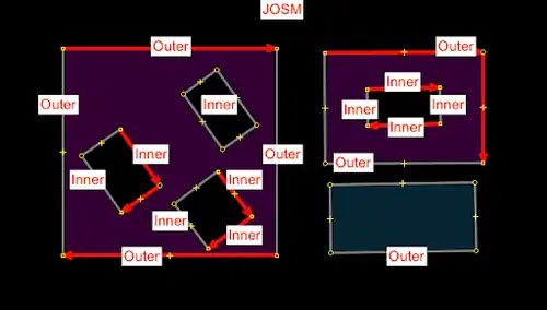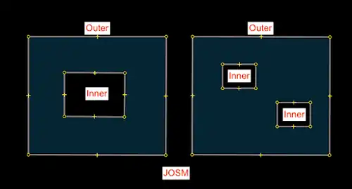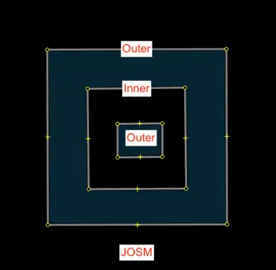 CMD + B|Ctrl + Bto combine them as a multipolygon.- This will automatically apply the "outer" and "inner" roles to the members of the relation.