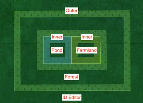In this example, there is a pond and farmland in the middle of a forest.