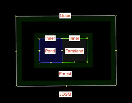 natural=*,landuse=*,building=*,highway=pedestrian, etc.- Note: The relation must have at least one tag to describe the feature. In some cases, you may need to create a separate multipolygon as the addition of other informative tags may have conflicting interpretations.