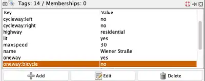 The oneway:bicycle=yes, oneway:bicycle=no or oneway:bicycle=-1 tags are used to define oneway restrictions for cyclists. For an explanation of this tag and its usage, refer to the Bicycle page.