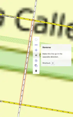 When adding oneway=yes to a road, first check the direction of the way in OSM. Each linear way has a defined direction, which should match the permitted direction of traffic on a oneway road. In the screenshot below, arrows show the way’s drawing direction; this direction determines how traffic will flow once the oneway tag is applied.