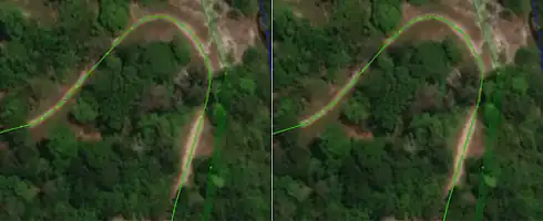 Just as too many nodes can be problematic, mapping roadways with too few nodes can lead to poor map data. In this example, we can see a rounded section of roadway that has been generalized as a sharp angle. Aligning this roadway to imagery and adding more nodes significantly improves this feature.