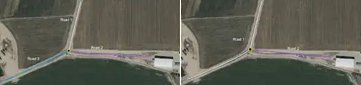 In many cases, using fewer nodes can benefit the overall road geometry. For these small corners, 3-5 nodes is typically sufficient. In this example, see the difference between 8 nodes and 3 nodes on the same roadway. Visually, the roadway with fewer nodes looks better.
