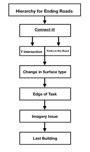 When deciding where to stop digitizing a road, where to connect it, or even where to change a road’s classification, consider the “Stoparchy”. This helpful resource is a hierarchical system used to determine where a roadway will end. The most desirable way to end a road is to connect it to another road, but this isn't always possible.