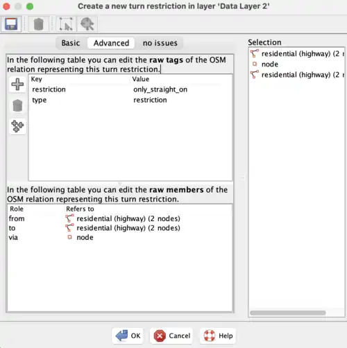 - If you select the ways/nodes in this order the plugin will be able to tell what kind of turn restriction it is and will apply the roles and tags of the relation for you.