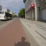 Jó minőségű, térkővel burkolt, sávok nélküli, elég keskeny osztott kerékpárút, az elválasztást színes térkő jelöli (belterületen)