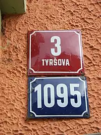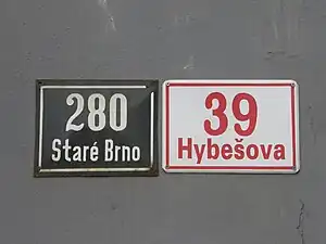 addr:conscriptionnumber in the Staré Brno district, 39 is the addr:streetnumber on Hybešova streetFor instructions on tagging addresses in the Czech Republic see Czech address system(cs).