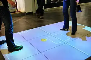 | attraction | game_installation | Stage or desk utilising projectors, VR or AR and capturing people's motions (e.g., via cameras) to allow for cooperative or competitive games including dancing. |
