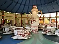 | attraction | teacup | teacup-shaped spinning vehicles atop a turntable-like floor, which may also spin. |