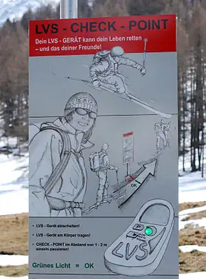 An avalanche transceiver, also know as Avalanche Victim Detector (AVD), also known as avalanche beacon is a small electronic device a skier (ski touring, backcountry, off-road, etc), snowmobile user, or anyone in an avalanche risk zone has under his clothes, in "emission" (aka "transmitting") mode. If the person is taken by an avalanche, the others members of his group turn their avalanche transceiver in "search" (or "receive") mode and it helps finding your friend alive under the snow. An avalanche transceiver is one the three basic emergency tools every backcountry skier have (with avalanche probe and shovel).