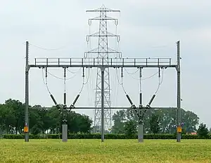 Power line transition to underground cable section. The overhead line clearly appears to support 2 circuits.
