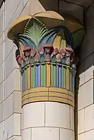 | Long indentations/ridges along the shaft/trunk, with an intricate palm leaf design (similar to Corinthian) topped by a folded spiral (similar to Ionic) as the capital