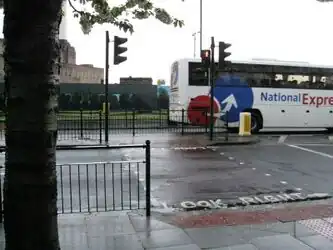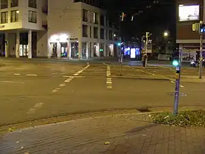 This is very similar to the crossing with traffic lights above, but it's larger and there's an explicit signal for cyclists. In France, a segregated crossing lane for cyclists may be bordered by distinctively coloured dashed lines. In some locations this is known as a Toucan crossing (traditional British name, like "two-can"). See also Toucan crossing on Wikipedia. |