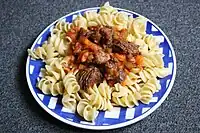 | pasta | A dish made from noodles or other shapes of boiled wheat dough, originating in Italy | ![]() | |