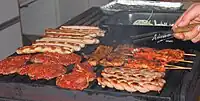 | kebab | A meat dish cooked on a stick. Can refer to either doner kebab or shish kebab. | ![]() | |